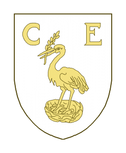 Une cigogne debout sur son nid, tenant en son bec un rameau de laurier, surmonté des lettres C.E.