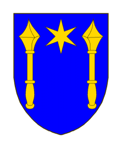 D’azur à deux masses en pal d’or, accostant une étoile du même posée en chef.