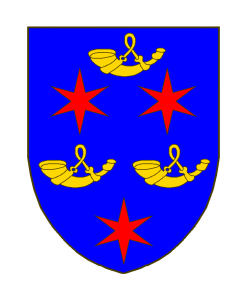D’azur à trois cors virolés, mal ordonnés d’or, accompagnés de trois étoiles à six rais de gueules, posées 2 – 1.
