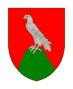 De gueules au faucon d’argent, surmontant une colline de sinople.