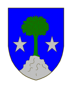 D’azur à un rocher d’argent sommé d’un chêne de sinople, accosté de deux étoiles d’argent.