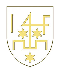 Une tige brisée en crénaux de deux pièces, abaissée, sur le milieu de laquelle s’élève une tige verticale, terminée en chef en chiffre 4, lequel est flanqué des lettres I et F, dont la dernière attachée à la traverse du chiffre, le tout accompagné de trois étoiles à six rais, deux auxflancs, une en pointe.