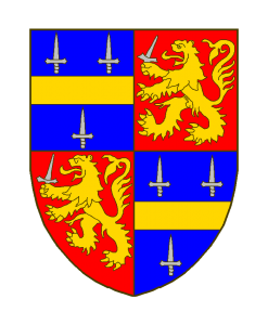 Écartelé: aux I et IV d’azur à la fasce d’or, accompagnée de trois glaives d’argent, deux en chef, un en pointe, aux II et III de gueules au lion d’or, tenant de la dextre un glaive d’argent (les II et III étant une concession).
