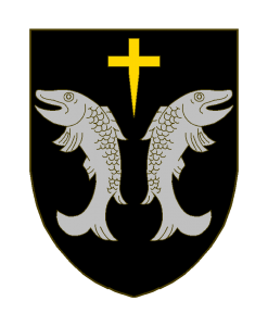 De sable à deux barbeaux (ou saumons) adossés d’argent, accompagnés en chef d’une croisette recroisettée au pied fiché d’or.