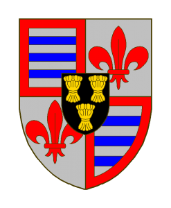Écartelé: aux I et IV d’argent à trois fasces d’azur, à la bordure de gueules, aux II et III d’argent à la fleur de lis de gueules, sur le tout un écusson de sable à trois gerbes d’or.