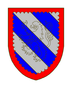 Bandé d’argent et d’azur (ou d’argent à trois bandes d’azur), à l’ombre de lion brochant, à la bordure engreslée de gueules.