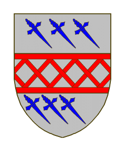 D’argent à la fasce du même, Frettée d’une tire de gueules et bordé du même, accompagnée de six poignards d’azur, la pointe en haut, posés en barre, trois en chef, trois en pointe.