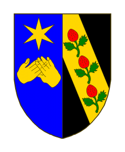 Parti au I d’azur à deux mains droites jointes en chevron d’or, surmontées d’une étoile à six rais du même, au II de sable à la bande d’or chargé de trois fraises au naturel, chacune tigée, à deux feuilles.