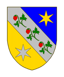 Tranché, d’azur à l’étoile à six rais d’or, et d’or à l’étoile à six rais d’argent, une bande d’argent chargé de trois fraises de gueules tigées et feuillées de deux pièces, de sinople, brochant.