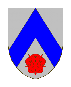 D’argent au chevron d’azur, accompagné en pointe d’une rose de gueules.