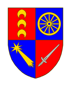 écartelé au I de gueules à trois échaudés en forme de croissant renversé d’or, au II d’azur à une roue d’or, au III d’azur à une comète d’or, au IV d’azur à une épée d’argent mise en bande.