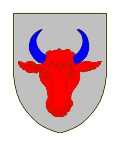 D’argent au rencontre de taureau de gueules, corné d’azur.