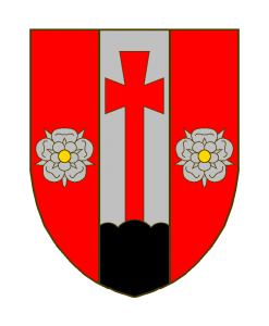 (De gueules au pal d’argent chargé d’une) croix pattée, (posée sur un mont de trois coupeaux de sable le pal accosté de deux roses d’argent) boutonnées d’or