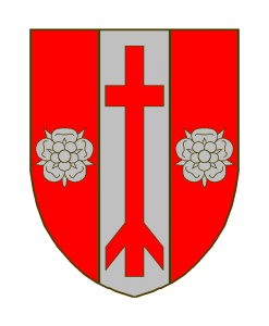 De gueules au pal d’argent chargé d’une croix latine alésée de gueules, dont le pied se termine par trois branches, le pal accosté de deux roses d’argent.