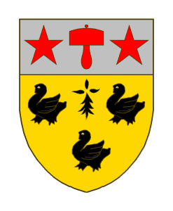 D’or à trois merlettes de sable, accompagnées en abîme d’une moucheture d’hermine de sable, au chef cousu d’argent, au maillet accosté de deux étoiles, le tout de gueules.