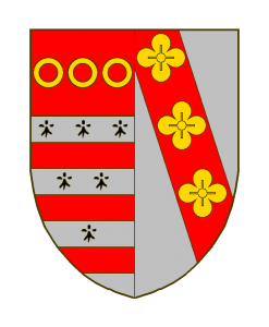 Parti au I d’argent à trois fasces de gueules accompagnées de six mouchetures d’hermine de sable, 3 2 – 1, au chef de gueules chargé de trois annelets d’or (Gourcy), au II d’argent à la bande de gueules chargé de trois quartefeuilles d’or (Serainchamps).