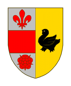 Parti, d’argent à la fasce de gueules, accompagnée en chef d’une fleur de lis, en pointe d’une rose,le tout du même, et d’or à une merlette de sable.