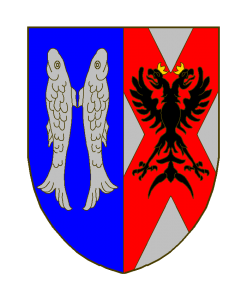 Parti, au I d’azur à deux barbeaux adossés d’azur, au II d’argent au sautoir de gueules, chargé d’une aigle impériale de sable couronnée d’or.