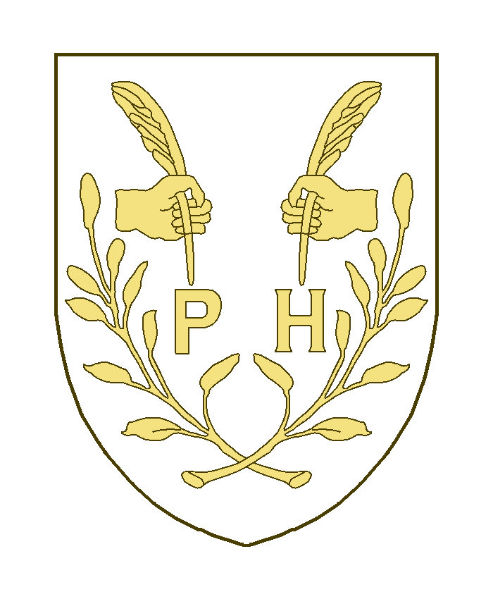 Deux mains affrontées, tenant chacune un plume, surmontant les lettres P et H, le tout accosté de deux rameaux feuillés, passés en sautoir en pointe.