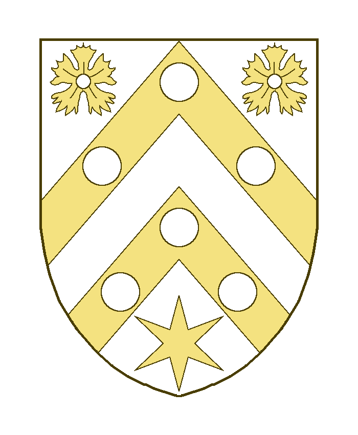 Deux chevrons, chargés chacun de trois besants ou tourteaux, accompagnés en chef de deux quintefeuilles en forme de fleur d’oeillet, en pointe d’une étoile à six rais.