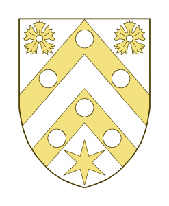 Deux chevrons, chargés chacun de trois besants ou tourteaux, accompagnés en chef de deux quintefeuilles en forme de fleur d’oeillet, en pointe d’une étoile à six rais.
