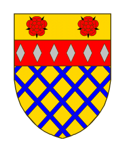 D’or à une fasce haussée de gueules, chargé de six losanges d’argent, accompagnée en chef de deux roses de gueules pointées de sable et soutenue en pointe d’un treillissé (= fretté) d’azur.