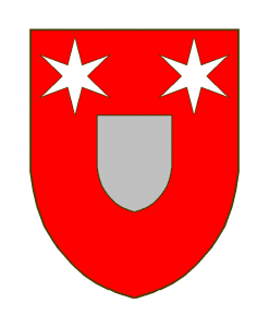 (De gueules) à l’écusson (d’argent), accompagné en chef de deux étoiles à six rais. (ou d’une étoile, en chef, à dextre, O.G.).