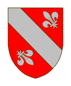 De gueules à la bande d’argent, accompagnée de deux fleurs de lis du même, posées en bande, celle en pointe renversée.