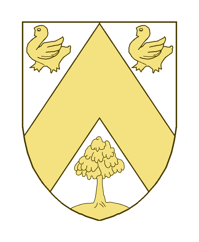 Un chevron, accompagné en chef de deux merlettes, en pointe d’un arbre terrassé .