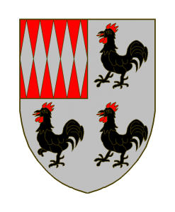 D’or à trois coqs de sable, crêtés, lampassés et barbés de gueules, au franc-quartier de gueules à cinq fusées d’argent.