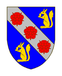 D’azur à la bande d’argent chargé de trois roses de gueules et accompagnée de deux écureuils accroupis d’or, mangeant une noix.