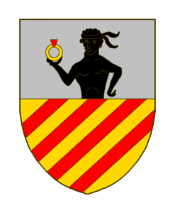 Coupé, en chef d’argent à un nègre issant de sable posé de front et tenant de la main droite un anneau d’or au chaton de gueules, en pointe d’or à quatre barres de gueules.