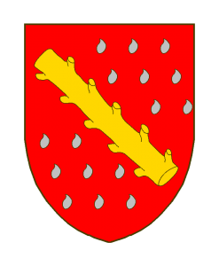 De gueules à un bâton noueux d’or péri en bande, accompagné de seize larmes d’argent, huit en chef, posées 3 – 3 – 2, huit en pointe posées 2 – 3 – 3.