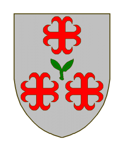 D’argent à trois croix ancrées de gueules, une en chef, deux en pointe, et une branche de deux feuilles de laurier de sinople posée en coeur.
