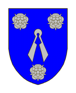D’azur à la force renversée d’argent, accompagnée de trois roses du même.