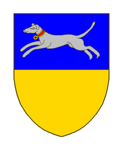 Coupé, en chef d’azur au lévrier courant d’argent, lampassé de gueules, colleté d’or, bordé de gueules, en pointe d’or plain.