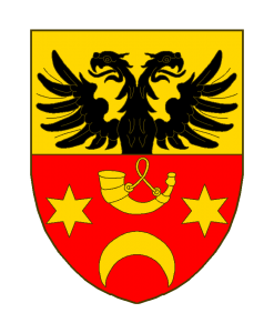 Coupé, au I d’or à l’aigle bicéphale naissante de sable, au II de gueules au cor de chasse d’or, accosté de deux étoiles du même, et accompagné en pointe d’un croissant également d’or.