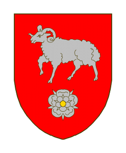 De gueules à la rose d’argent, boutonnée d’or, surmontée d’un bêlier passant d’argent, la tête de profil.