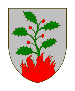 D’argent au houx de sinople de cinq feuilles, fruité de gueules de 4pièces, et issant de cinq flammes du même.
