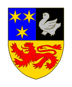 Coupé, en chef parti d’azur à trois étoiles à six rais d’or, et de sable à la merlette d’argent, en pointe d’or au lion (passant) de gueules.
