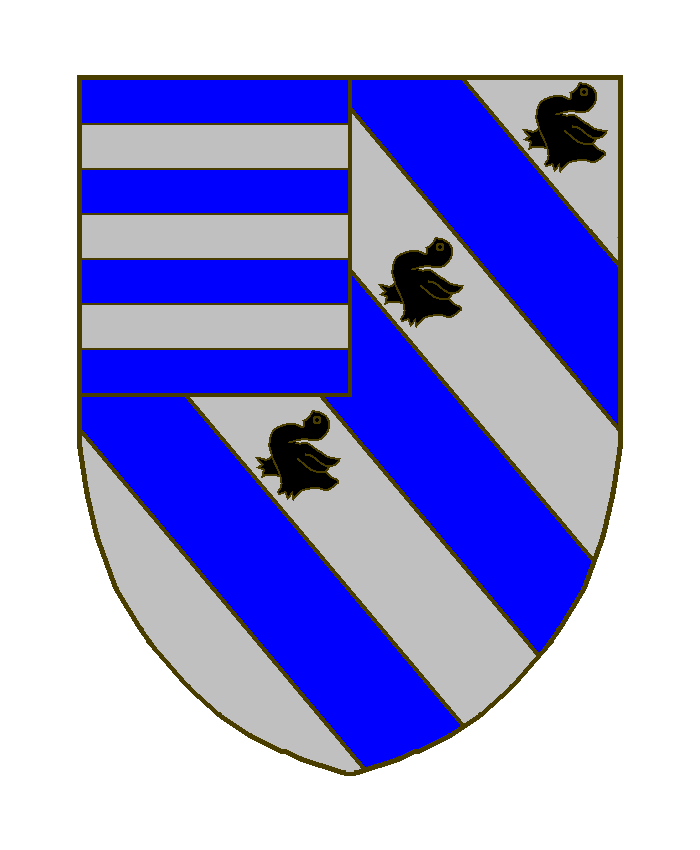 D’argent à trois bandes d’azur, chacune surmontée d’une merlette de sable posée dans le sens de la bande, le franc-quartier d’azur à trois fasces d’argent.