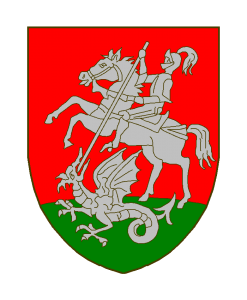 De gueules au saint Georges armé de toutes pièces, sur un cheval bondissant, tuant le dragon, le tout d’argent, posé sur une terrasse de sinople.