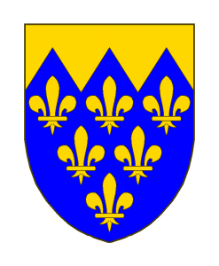 D’azur à six fleurs de lis d’or posées 3 – 2 – 1, au chef diminué emmanché d’or.