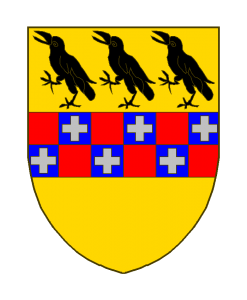 D’or à la fasce échiquetée de deux traits de gueules et d’azur, les pièces d’azur chargées de croisettes d’argent, la dite fasce accompagnée en chef de trois corbeaux de sable, la tête levée, le bec ouvert, et une patte en l’air.