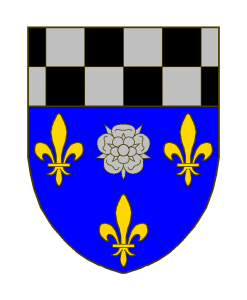D’azur à trois fleurs de lis d’or, accompagnés en coeur d’une rose d’argent, au chef échiqueté de sable et d’argent de deux tires.