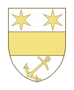 Une fasce, accompagnée en chef de deux étoiles à six rais, en pointe d’une ancre en barre.