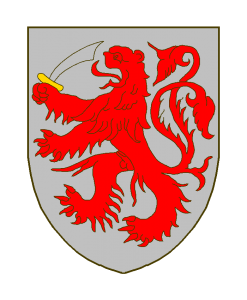 D’argent au lion de gueules, lampassé du même, la queue relevée en sautoir, tenant de la dextre un cimeterre d’argent, garni d’or.