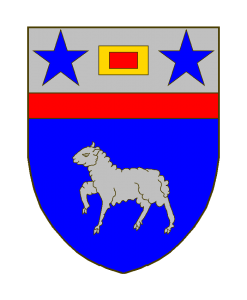 D’azur au mouton passant d’argent, au chef du même soutenu de gueules, chargé d’une billette couchée d’or, percée en carré de gueules, accostée de deux étoiles d’azur.