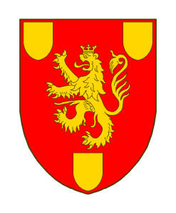 De gueules au lion couronné d’or, accompagné de trois écussons du même, deux en chef, une en pointe.