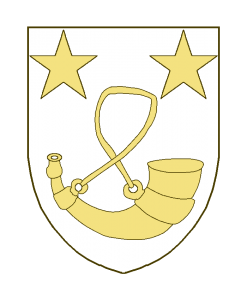 Un cor de chasse contourné, surmonté de deux étoiles.